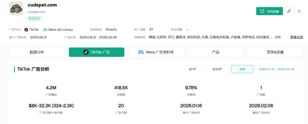 流量层级: 在短短 20 天的投放周期内(1月16日-2月6日),单条视频素材狂飙至 420 万次播放,且目前仍在持续跑量;