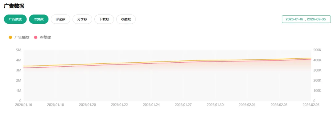 大错特错。 我们要看具体的每日数据:直到 2 月 5 日,这条广告依然保持着每天 4.8 万 - 6.5 万 的播放量,且点赞数稳定在 6000 左右。