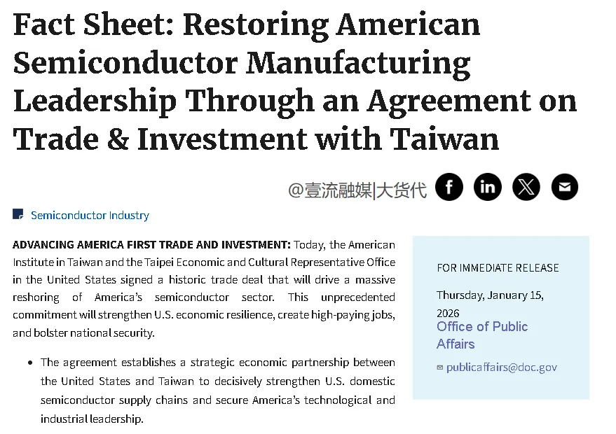 根据美国商务部表示,在当地时间2026年1月15日,美国与中国台湾签署了一项历史性的贸易协议,该协议将推动美国半导体产业大规模回流,增强美国经济韧性,创造高薪就业机会,并巩固国家安全。