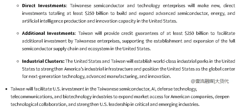 直接投资:中国台湾半导体和科技企业将在美国进行总额至少2500亿美元的新直接投资。