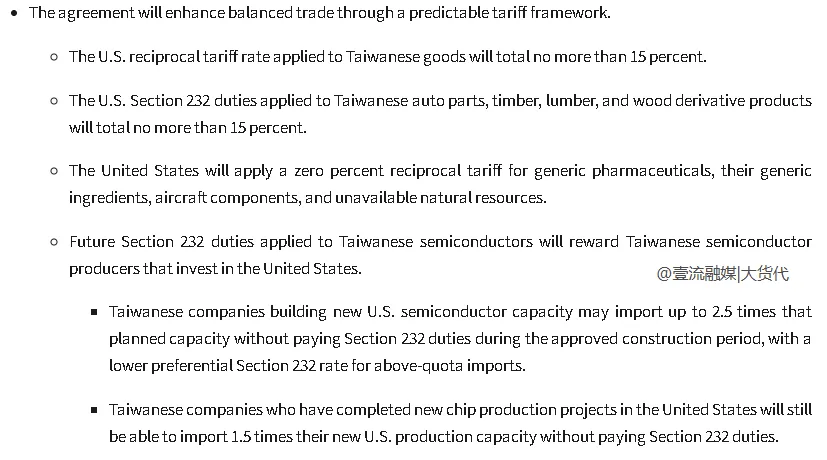 美国对从中国台湾进口的商品征收的对等关税总额不会超过15%。