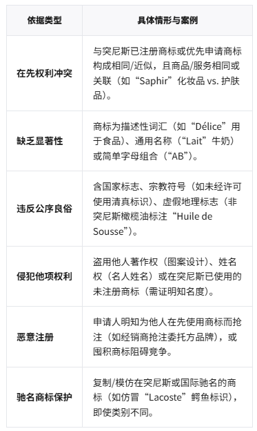 异议需基于《突尼斯商标法》第18条法定事由,核心依据包括: