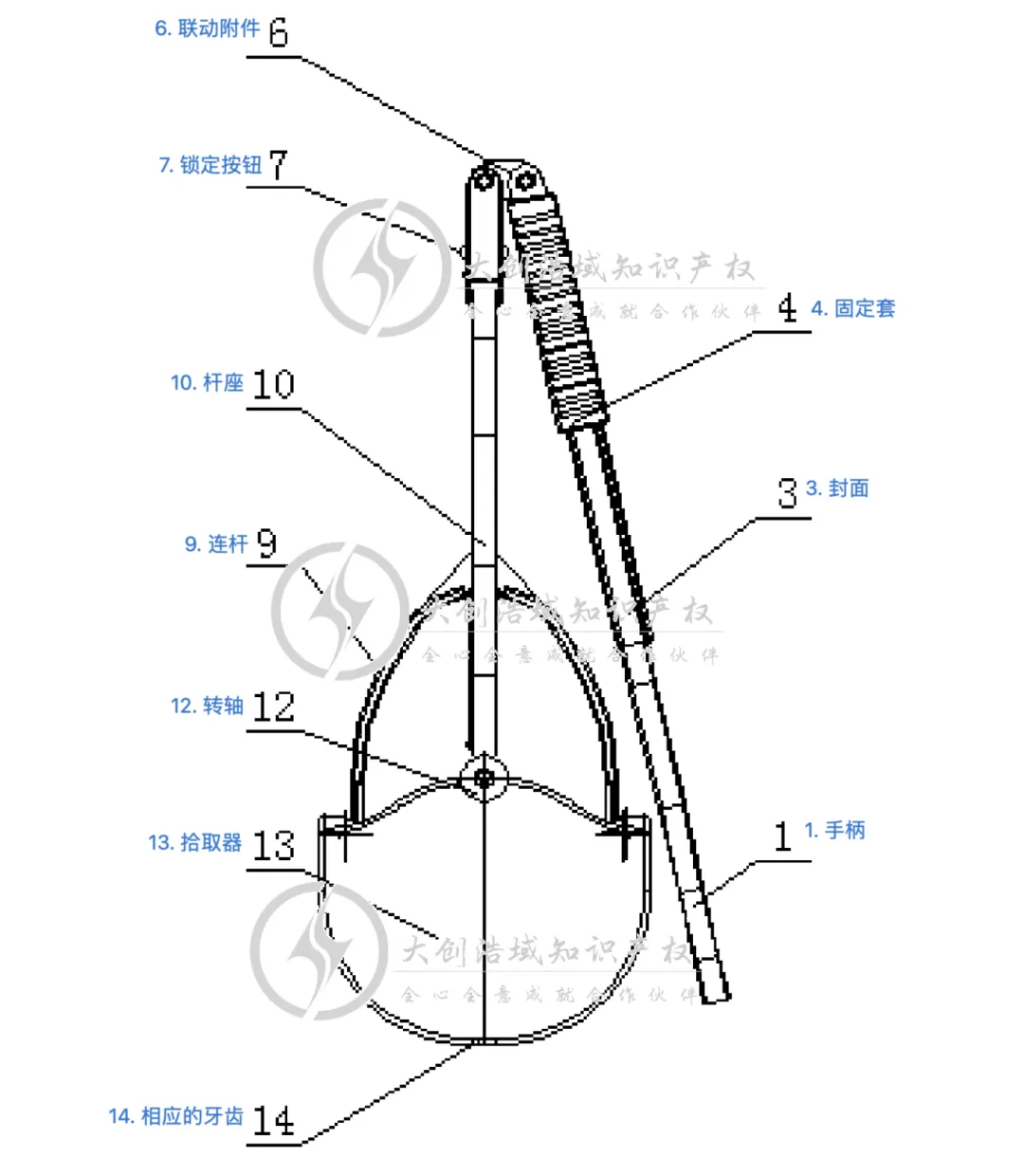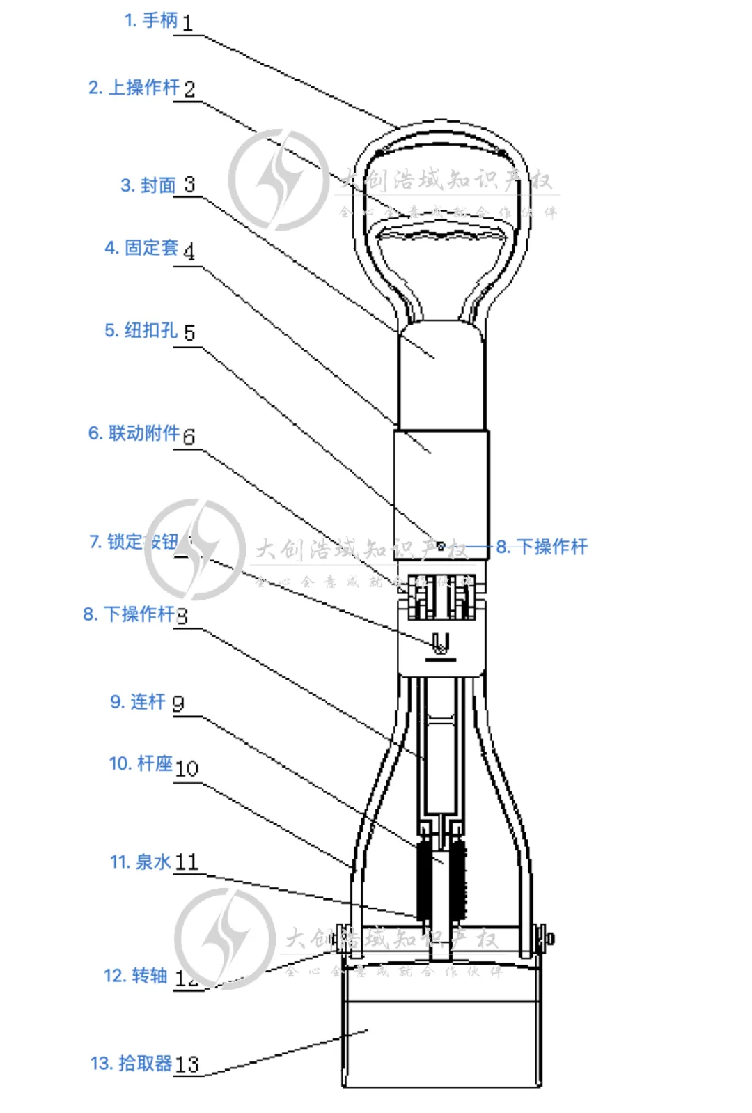 上操作杆向手柄移动时,一对拾取件张开;上操作杆远离手柄移动时,一对拾取件闭合;
