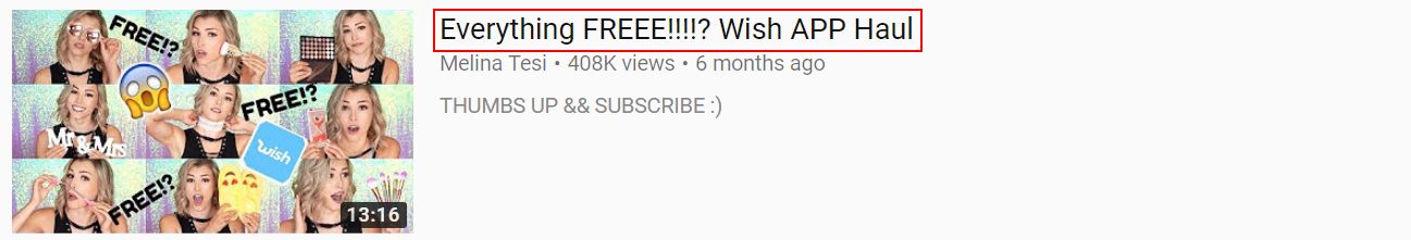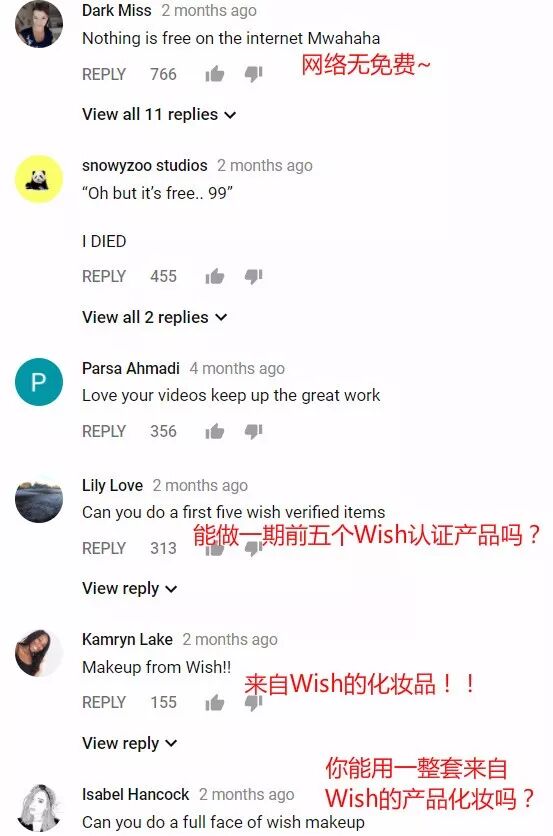 但是,仔细看视频的标题,商户感受到了惊吓!“everything free”“how to get free stuff”“free items from Wish”……这难道是要赤果果的欺诈吗?并不是!这些标题听上去像是教用户“学坏”,但绝大部分的视频内容只是在告诉用户如何在Wish平台寻找优惠商品而已~连网友的评论也都是比较中性或正面的,这可以说是相当标题党了。