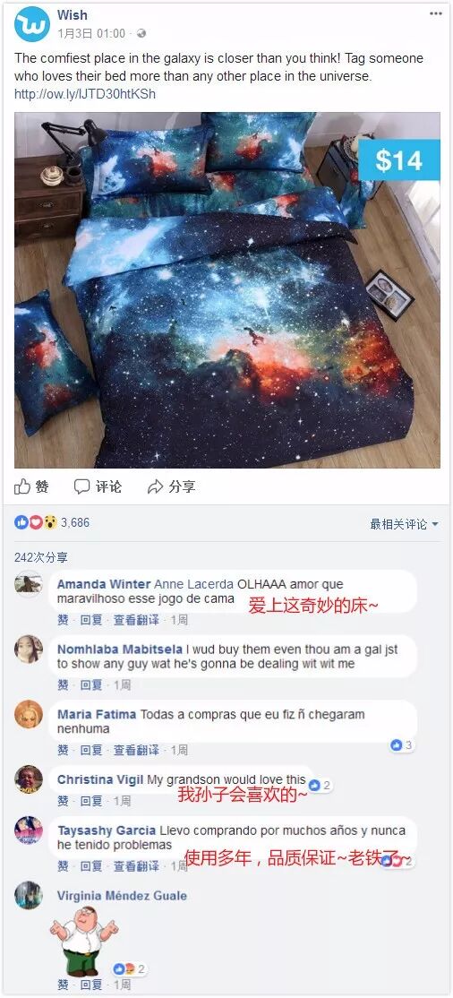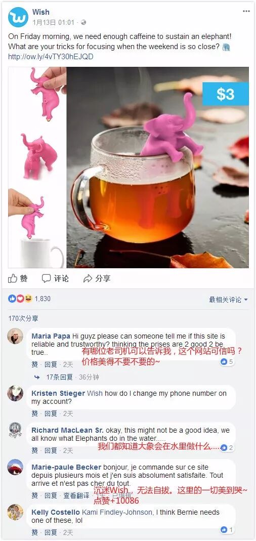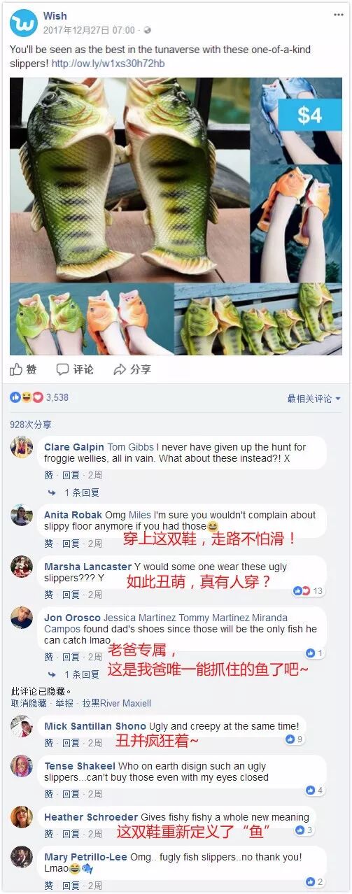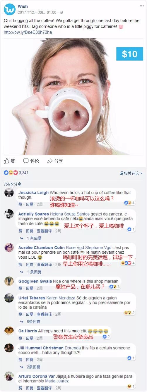 除了客户端,买家也会通过Facebook等社交账号表达一下在Wish上购物的感受,Wish的Facebook账号每天也会展示一些有意思的产品。观察下来就是:同一个世界,同一群戏精~随随便便一条Facebook就能炸出一群“加戏”买家,世界欠他们一座奥斯卡~