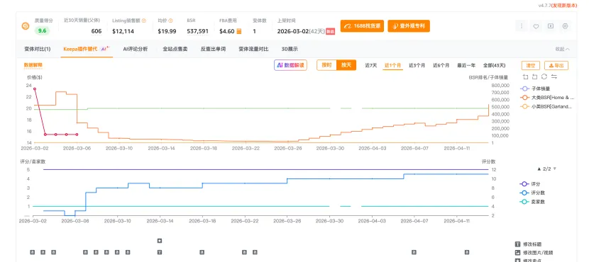前期权重积累完成,后期吃到季节需求顶峰。到了3月下旬之后,曲线出现了一个非常有意思的变化。大类BSR 在前期持续改善后,后段开始逐步走弱;但价格并没有明显跳水,评论仍在增加,小类表现也还不错。这并不意味着产品不行,恰恰相反,这说明它已经完成了最核心的任务前半段积累权重,后半段收割旺季流量。