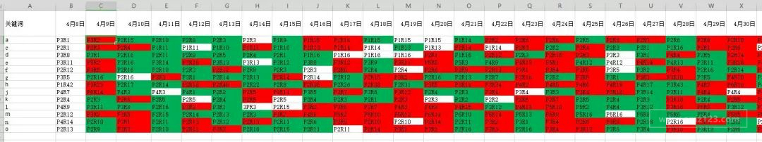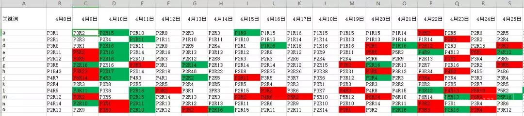 - 然后设置条件格式,用绿色表示关键词呈现上升趋势、用红色表示呈现下降趋势