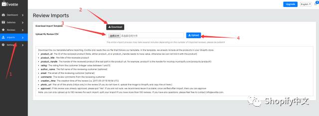 注意:在导入之前请下载CSV模版,我们的系统只能识别符合我们规范的CSV文件,在该CSV模版中会包含店铺所有产品信息(产品号,名称),方便你导入评论。 每次上传CSV最多只能上传100条,如果你有超过100条评论,请你分批上传,或者联系客服 info@evotte.com.