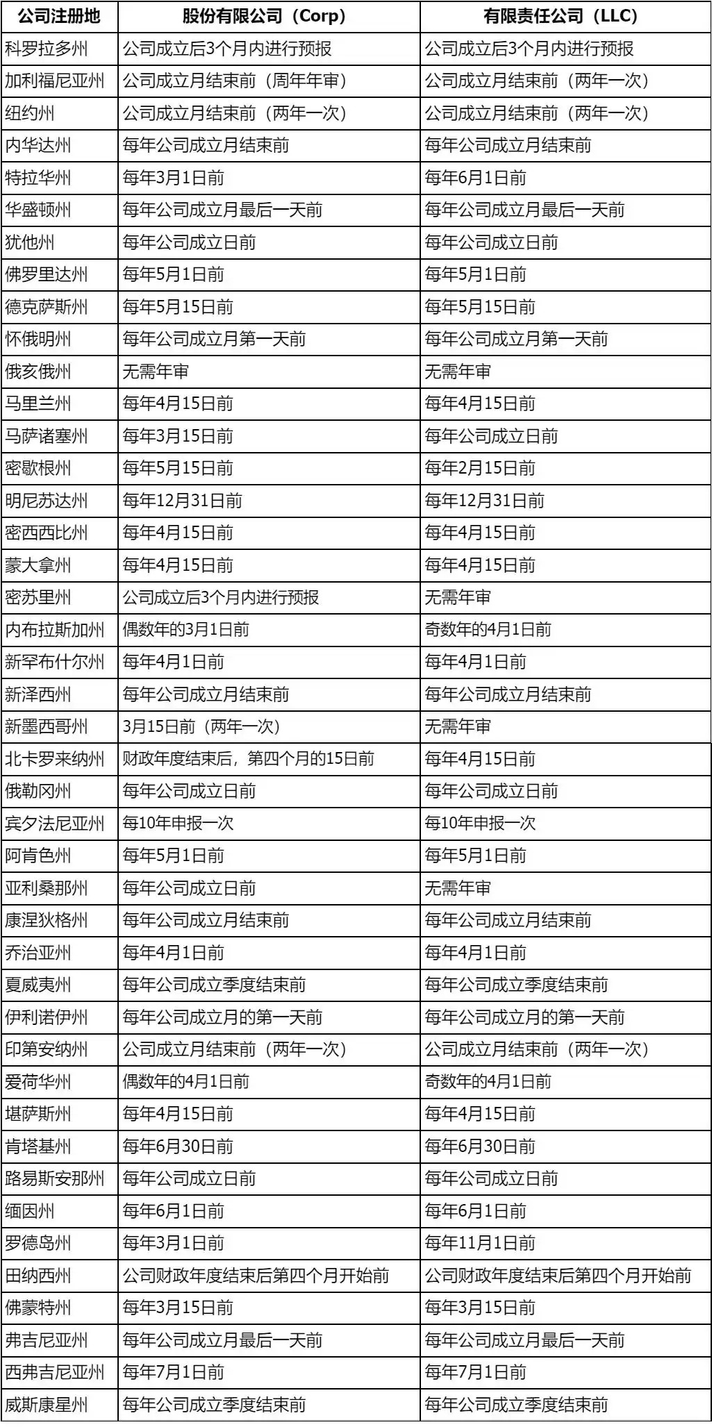 报税周期和年审时间会因公司注册形式以及所在州的不同而有所差异。