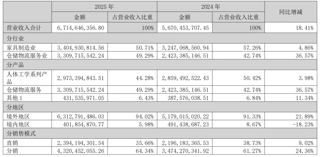 年报显示,2025年乐歌公共海外仓业务实现收入33.10亿元,同比增长36.57%,占营业收入比重提升至49.29%。这一收入规模已经超过人体工学系列产品。同期,乐歌人体工学系列产品实现收入29.73亿元,同比增长3.98%,占营业收入比重为44.28%。