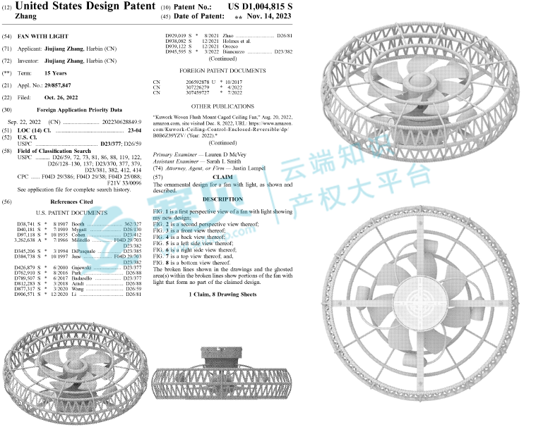 TRO诉讼中涉及的美国外观专利带灯风扇(FAN WITH LIGHT),专利号是US D1,004,815 S,于 2022年 10 月 26 日提交申请,2023 年 11 月 14 日获得美国专利局授权。 专利附图包含8个视图,整呈现了带灯风扇的外观形态,重点包括风扇外框结构、照明部件与风扇主体的组合方式、整体轮廓比例等。