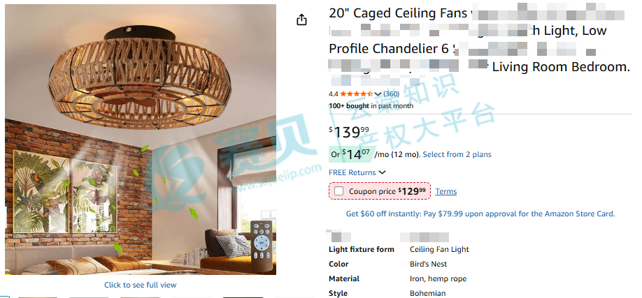 这起TRO案件的原告是JJ Zhang,来自中国哈尔滨,是涉案带灯风扇美国外观专利的发明人及合法权利人。该专利产品是一款波西米亚风格的笼式吊扇,可用于卧室、餐厅、客厅和厨房,吊扇灯的主体采用麻线包裹装饰,与人造木纹七叶扇叶相结合,还具有调光、风速调节、风扇反转和定时器功能。