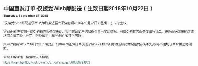 国庆前夕,Wish官方发布公告表示:“仅接受Wish邮配送订单’政策将推迟至太平洋时间2018年10月22日17时生效,之后如果中国大陆地区直发订单使用了除Wish邮以外的物流服务商配送商品将被处以每个违规订单10美金的罚款。”
