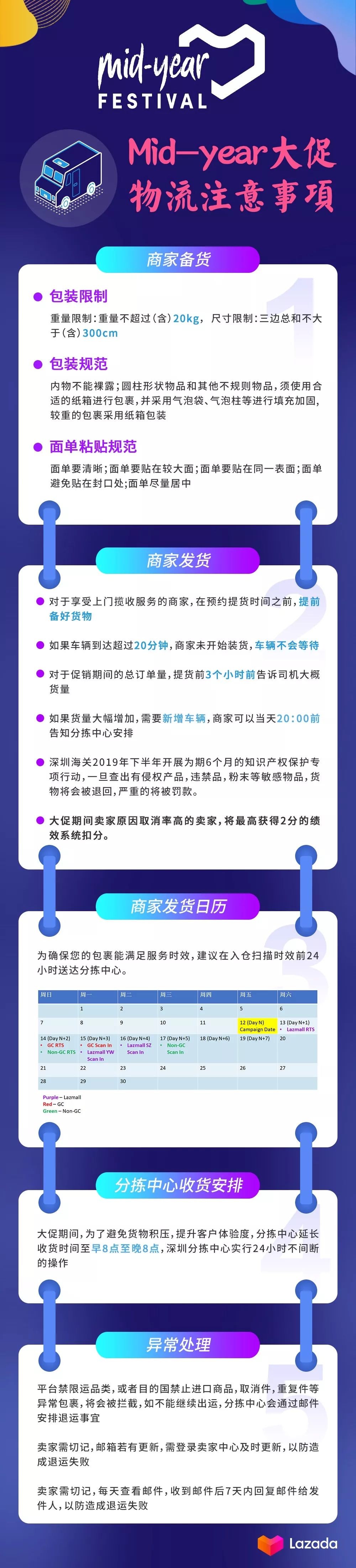 昨天小编连夜给大家整理了一份《Mid-year大促物流的注意事项手册》,主要是帮大家梳理一下本次大促的物流的注意事项。毕竟物流是电商发展的重要基础和支撑,所以这个环节很重要,为了让大家避开雷区,Lazada觉得还是有必要做下最后的提醒哦,请大家注意查收!