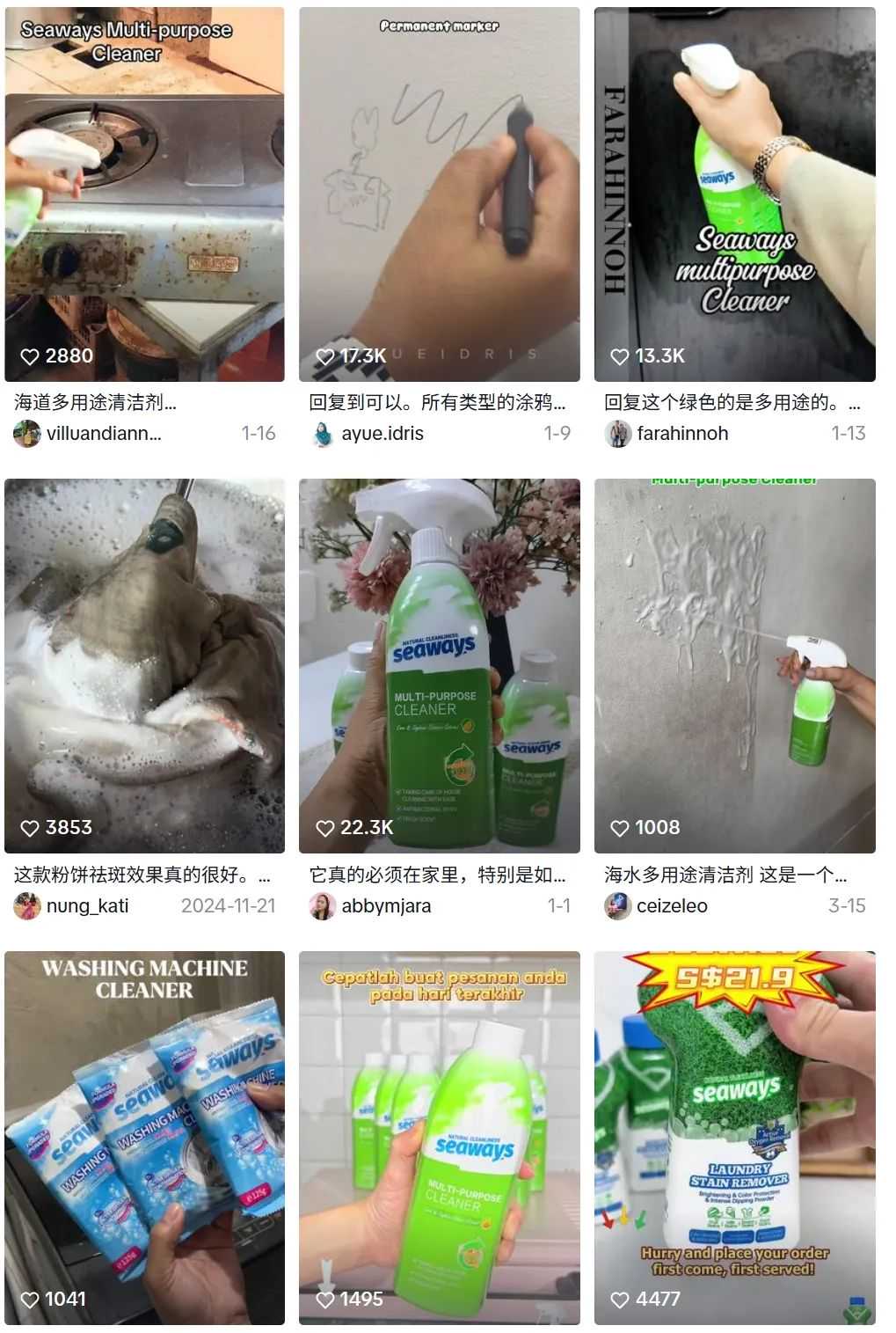 家清品牌 Seaways 的破局之道颇具代表性:它放弃国内抖音的夸张短剧风格,转而聚焦东南亚用户的清洁痛点 —— 一条浴室清洁剂视频直击 “顽固污渍” 难题,镜头里污渍快速瓦解的对比画面,配合 “温和不伤手” 的卖点,不仅成了爆款,更引来了 KOC 自发种草,一年后便登顶马来西亚家清市场。