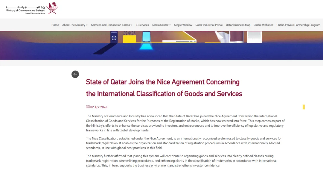 4月2日,卡塔尔商务与工业部宣布,卡塔尔加入国际商品与服务分类的《尼斯协议》。