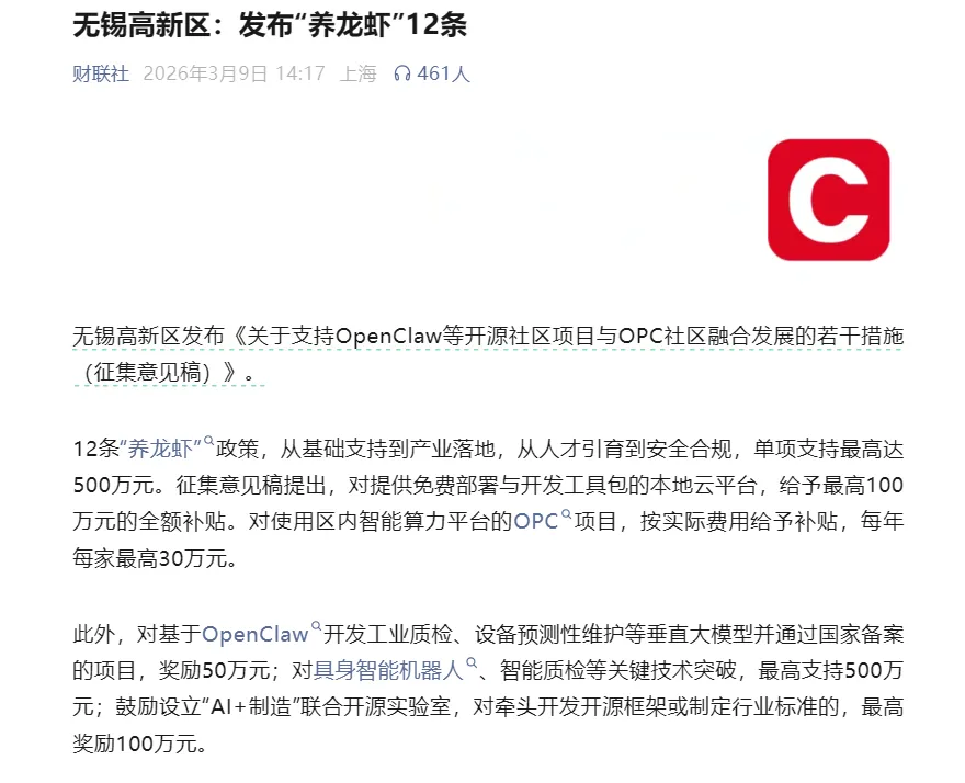 3月9日,无锡高新区发布《关于支持OpenClaw等开源社区项目与OPC社区融合发展的若干措施(征求意见稿)》,围绕基础支持、产业落地、人才引育等推出12条举措,补贴明细如下: