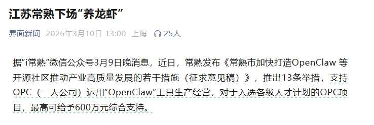 3月9日,常熟市发布《若干措施(征求意见稿)》,推出13条举措聚焦OpenClaw开源社区打造与OPC(一人公司)培育,核心补贴明细如下: