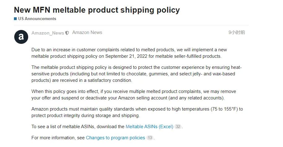 亚马逊美国站发布公告称,亚马逊针对可熔化卖家自配送产品实施新的可熔化产品运输政策,原因是与熔化产品相关的消费者投诉增加。2022年9月21日起,亚马逊移除所有可熔化ASIN,并且会按照移除的每件商品收取移除费用。