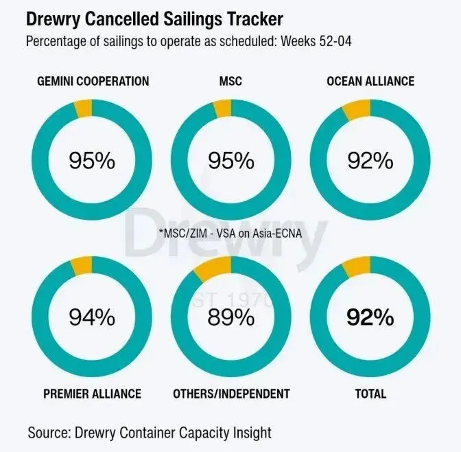 相关数据表明,在未来五周(2025年12月22日-2026年1月25日)内,总计规划的航次数量为704个,其中空班数量达到53个,取消率高达8%。从航线分布来看,跨大西洋西行航线受空班影响最为严重,占比达45%;其次是跨太平洋东行航线,占比38%;亚欧/地中海航线占比17%。仅在12月,就有75个航次被取消,这一举措使得有效运力环比增长了约2%。目前,已预告2026年1月初将有35个空班,预计会进一步释放约7%的运力。