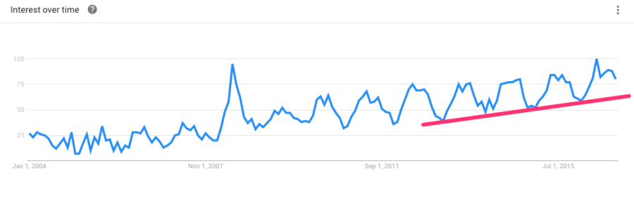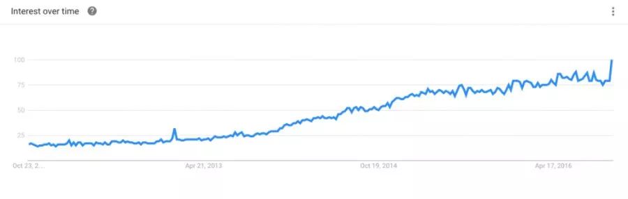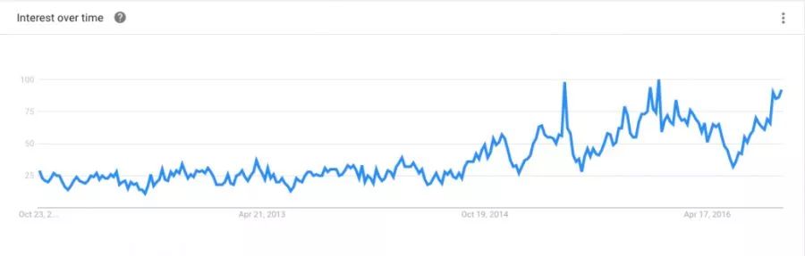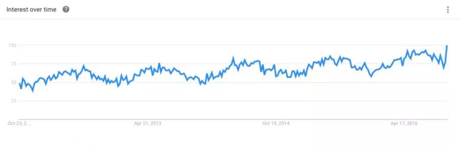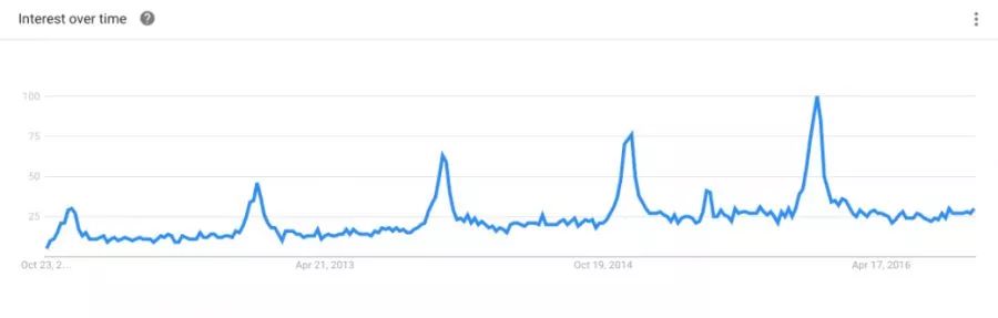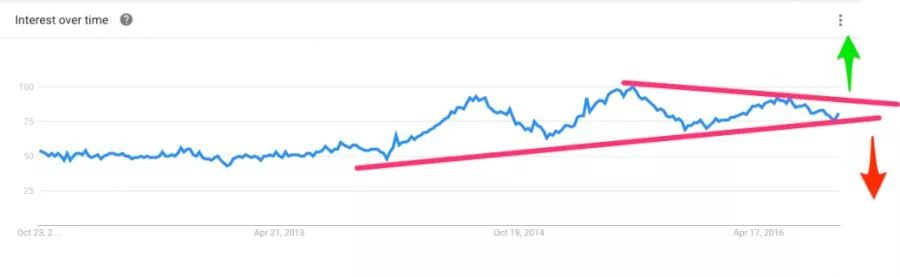谷歌趋势(Google trends)显示的是某段时期里,人们在谷歌上面搜索某些产品的趋势变化。