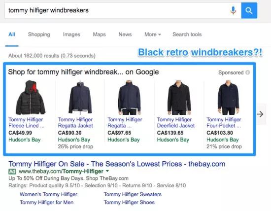 在第二个搜索中出现了广告。这意味着Hifiger先生赚取的利润,足够支付广告成本。当人们搜索Hilfiger windbreakers时,出现的促销广告自然也就是黑色复古风衣。