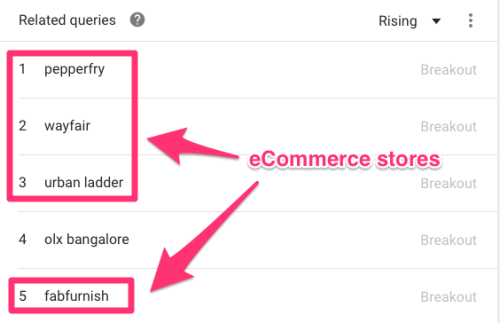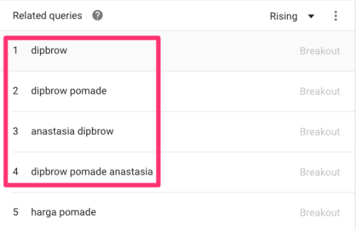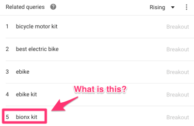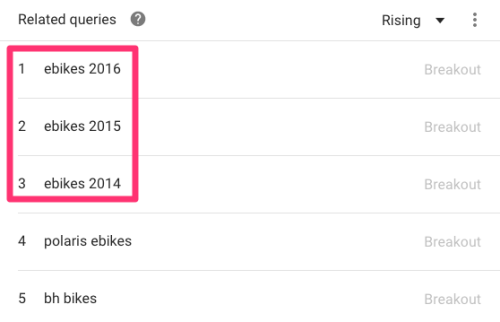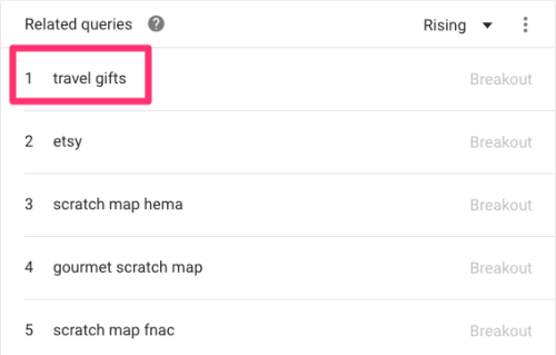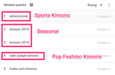 相关词条可以根据“Top Searches”或“Breakouts”排序。选择“Breakouts”,因为它代表着当前搜索量有较大增长的关键词。