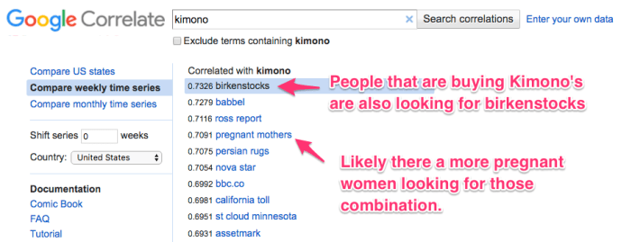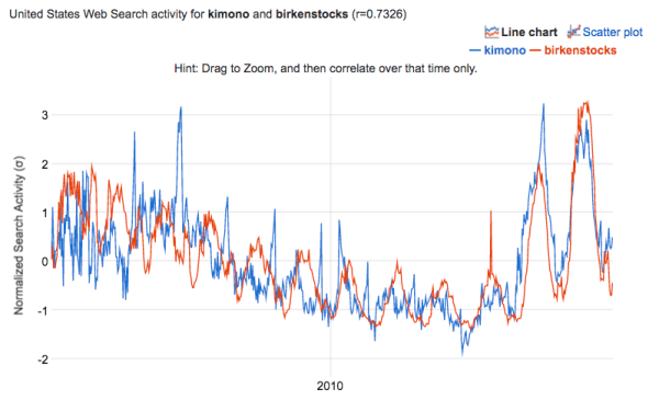 从上图可以发现,搜索“Kimono”的人,一般还会搜索“Birkenstocks”(勃肯鞋,德国凉鞋品牌)。Google Correlate通过数据,帮助卖家找到一种新的利基产品创意。