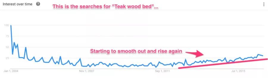 谷歌趋势仅追踪2004年以后的数据,事实上,一些商品(比如Teak Wood)在2004年之前的搜索率就非常高。