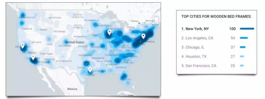 接下来,在Google Shopping Insights搜索“Wooden Bed Frames”,查看北美地区的市场需求。在输入的过程中,Google Shopping Insights会建议用“woodenbed frames”作为搜索词条,来代替“teak wood bed”。