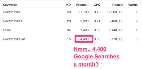 从图中也可以发现,“electric bike kit”作为关键词的搜索量更大,比“ebikes”更容易提升排名。