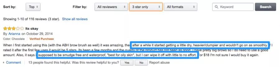 打开亚马逊网站,找到这款产品,查看评论页面,筛选出3星评论。看看人们在说什么,潜在的缺陷是哪些,及早发现产品的不足之处。