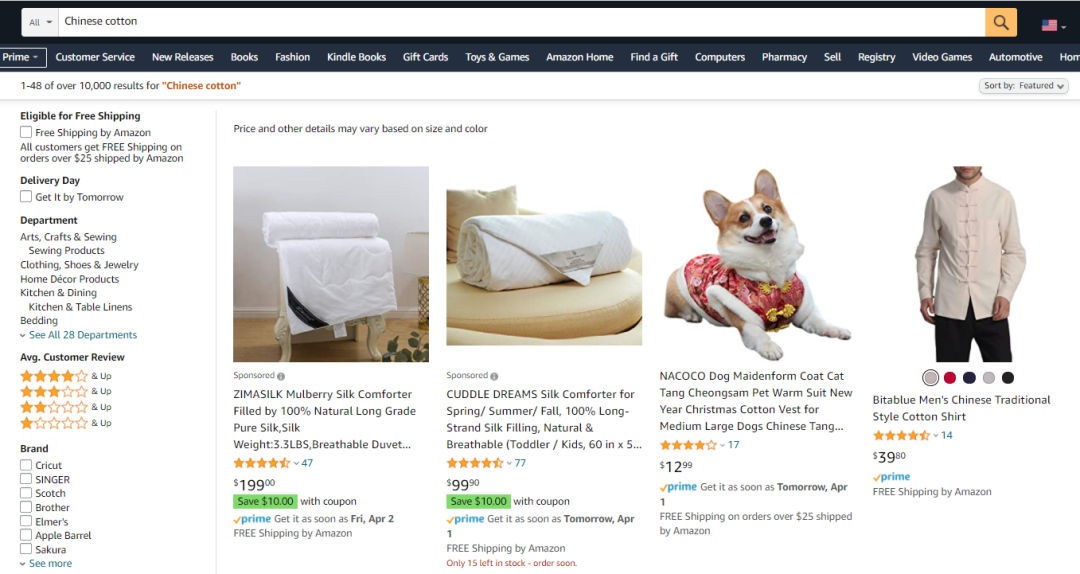 那么,事实上,亚马逊是否已经下架所有中国棉制品呢?据小编查阅,亚马逊平台上仍旧可以搜索到不少中国卖家的棉织品。