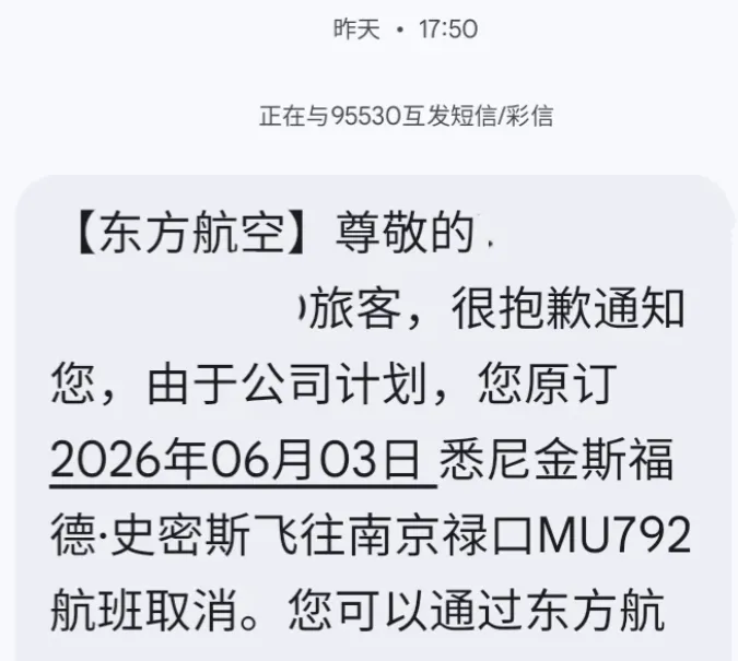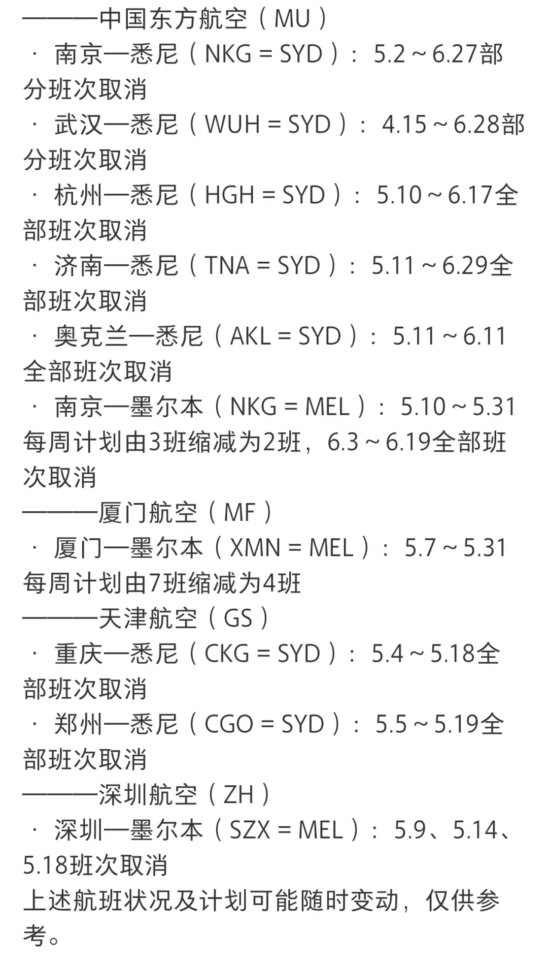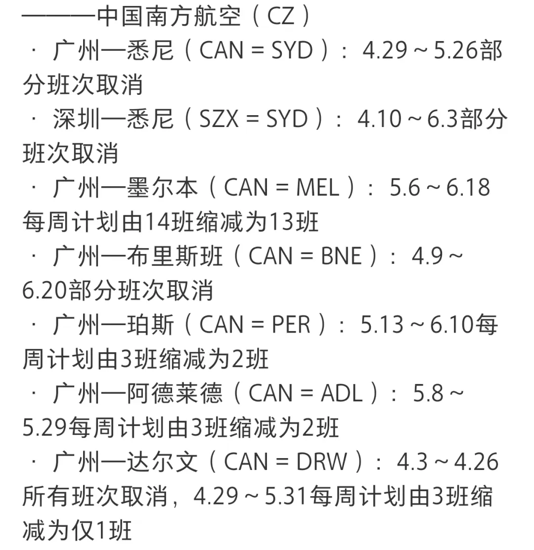 与此同时,多位旅客在社交平台反映,其预订的回国航班遭遇临时取消。据航旅资讯博主“AirHND”整理的信息显示,近期从澳大利亚、新西兰等地飞往中国多个二线城市的直飞航班出现批量调整,包括部分班次取消或整体航班计划缩减,受影响时段主要集中在2026年4月至6月。
