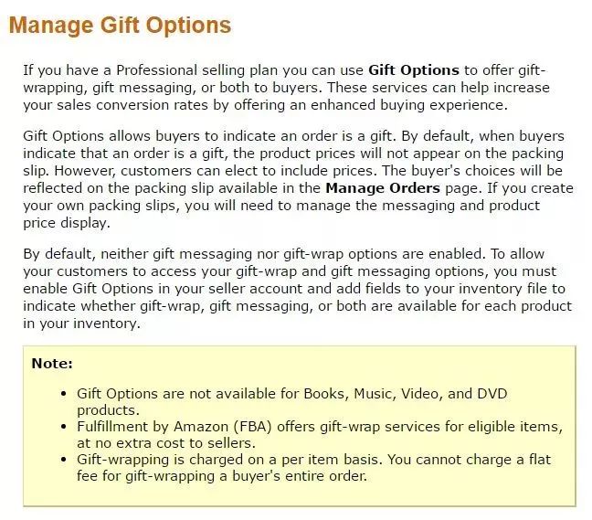 下面是卖家中心里,亚马逊关于“礼品”选项的规定: