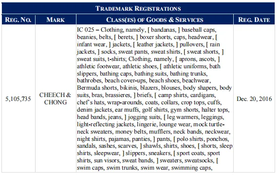 原告是一家注册于内华达州的公司,Cheech Marin 和 Tommy Chong是有史以来最成功的喜剧二人组之一。切奇和钟在70年代和80年代创作了一些最著名和受欢迎的喜剧专辑,包括《大竹子》和《洛斯科奇诺斯》,后者赢得了格莱美最佳喜剧录音奖。切奇和钟后来还发行了几部长片电影,其中许多被视为邪典经典,包括《烟消云散》、《切奇和钟的下一部电影》和《美好梦想》。Cheech和Chong在艺术上的成功为他们赢得了全球数百万粉丝。
