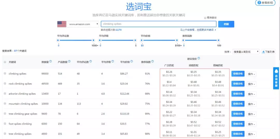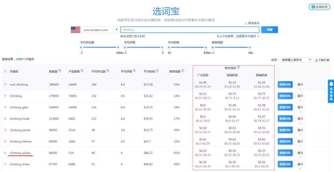 ①这个关键词挖掘出的结果bid竞价都比较低,说明这些词的投放人数较少。 ②排名第一的climbing spikes月搜索量接近10W,推荐指数达91%,但词下产品才500多个。