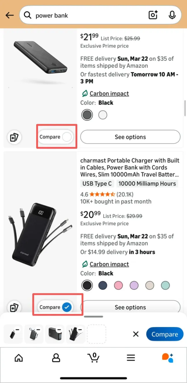 当买家输入关键词搜索产品后,部分搜索结果的产品图片下方会出现醒目Compare按钮,买家可自主勾选 1-5 款感兴趣的同类产品,点击确认后,系统将自动生成专属的AI产品对比面板。