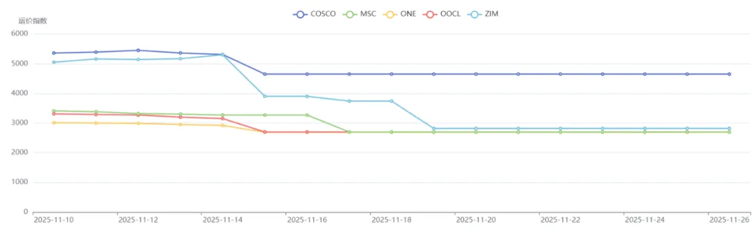 北美航线,美国结束了史上最长的政府“停摆”,但运输需求缺乏支撑,即期市场订舱价格下跌。11月14日,上海港出口至美西和美东基本港市场运价(海运及海运附加费)分别为1823美元/FEU和2600美元/FEU,分别较上期下跌17.6%、8.7%。