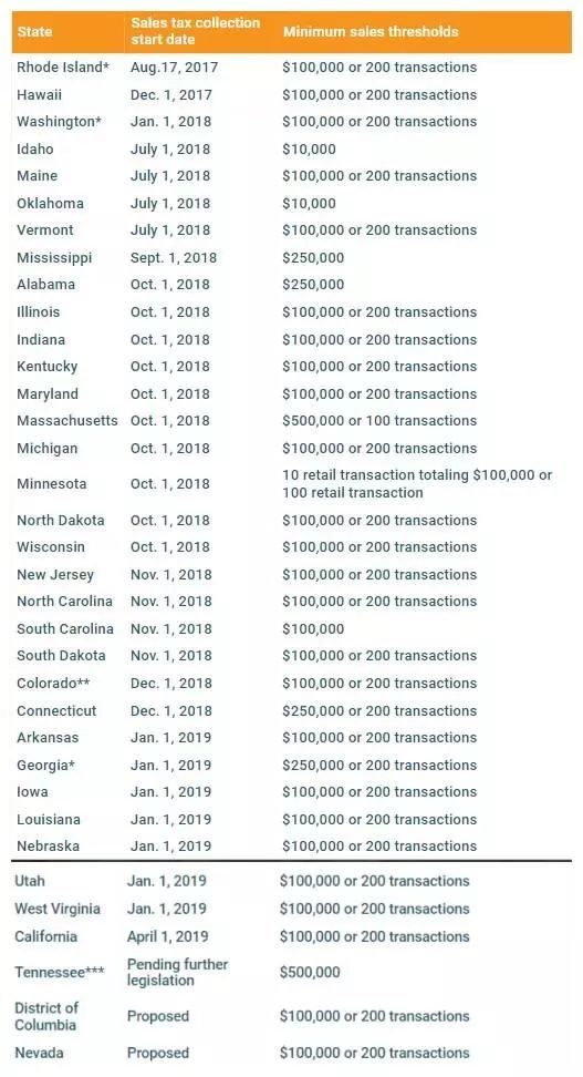卖家朋友们知道这意味着什么吗?这意味着截止2019年1月1日,全美共有31个州制定并生效了有关电商销售税的法案,要求在线零售商即使在没有实体店的情况下也要缴纳在线订单的相应税费。此外科罗拉多州的法案也已通过,定于2019年5月31日生效。