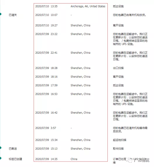 在此之后下单取件,UPS会根据自身航线的安排转运,有的会等到第二天,比如周一至周三的12点后下单取的件,有的会等到次日航班直飞美国,而周四-周五多数的会出现了去香港这样转飞的情况。