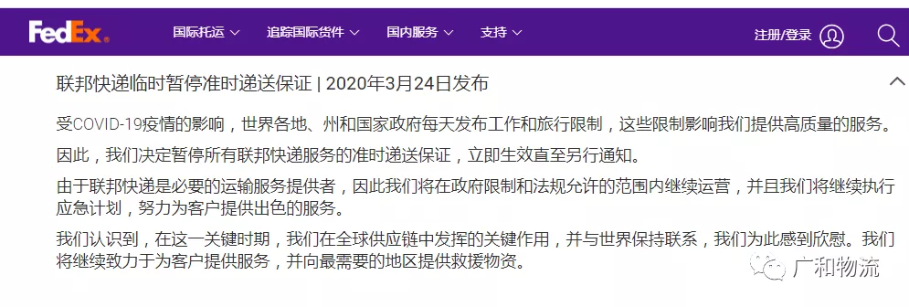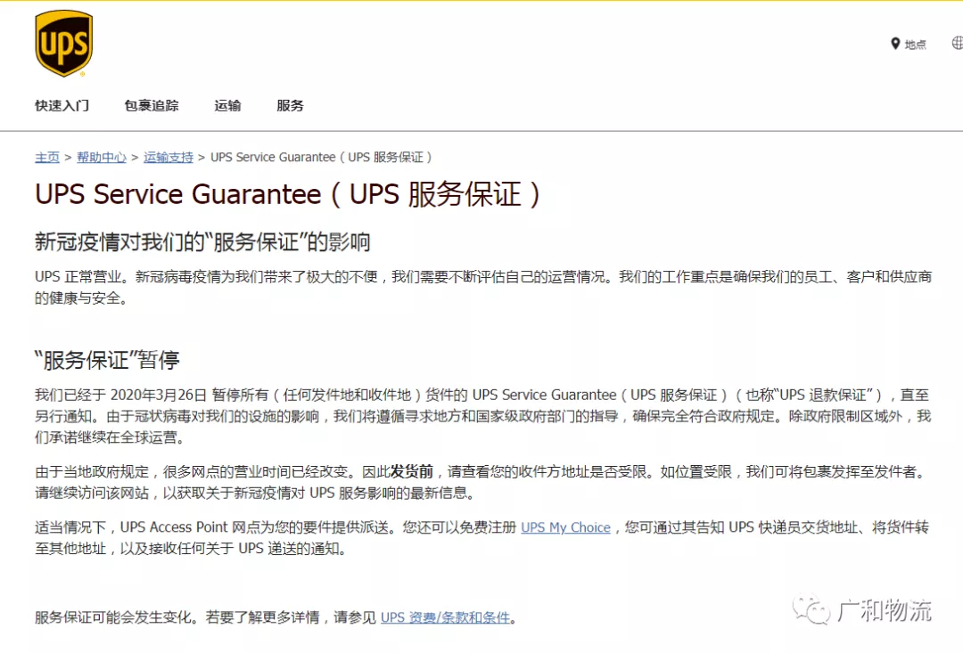 如果不是疫情,其实这样的转飞对于UPS来说,依旧在UPS自身的时效控制范围内(1-3个工作日)。只是疫情发生了以来,UPS、FedEx其实都相继发布了暂停时效保证的服务。