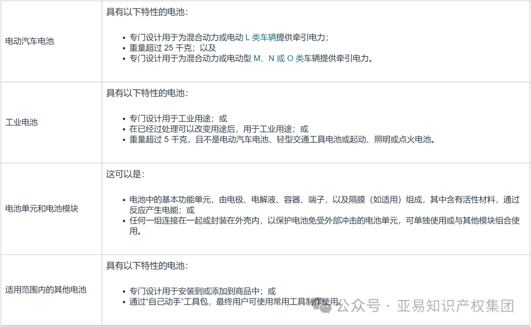 《欧盟电池法规》将“电池”定义为通过化学能直接转换产生电能的任何装置。它可以有内部或外部存储,由一个或多个不可充电或可充电的电池单元(模块或电池组)组成,包括经过处理可以再利用、经过处理可以改变用途、改变用途或再制造的电池。