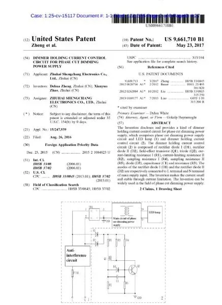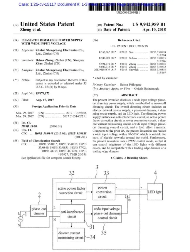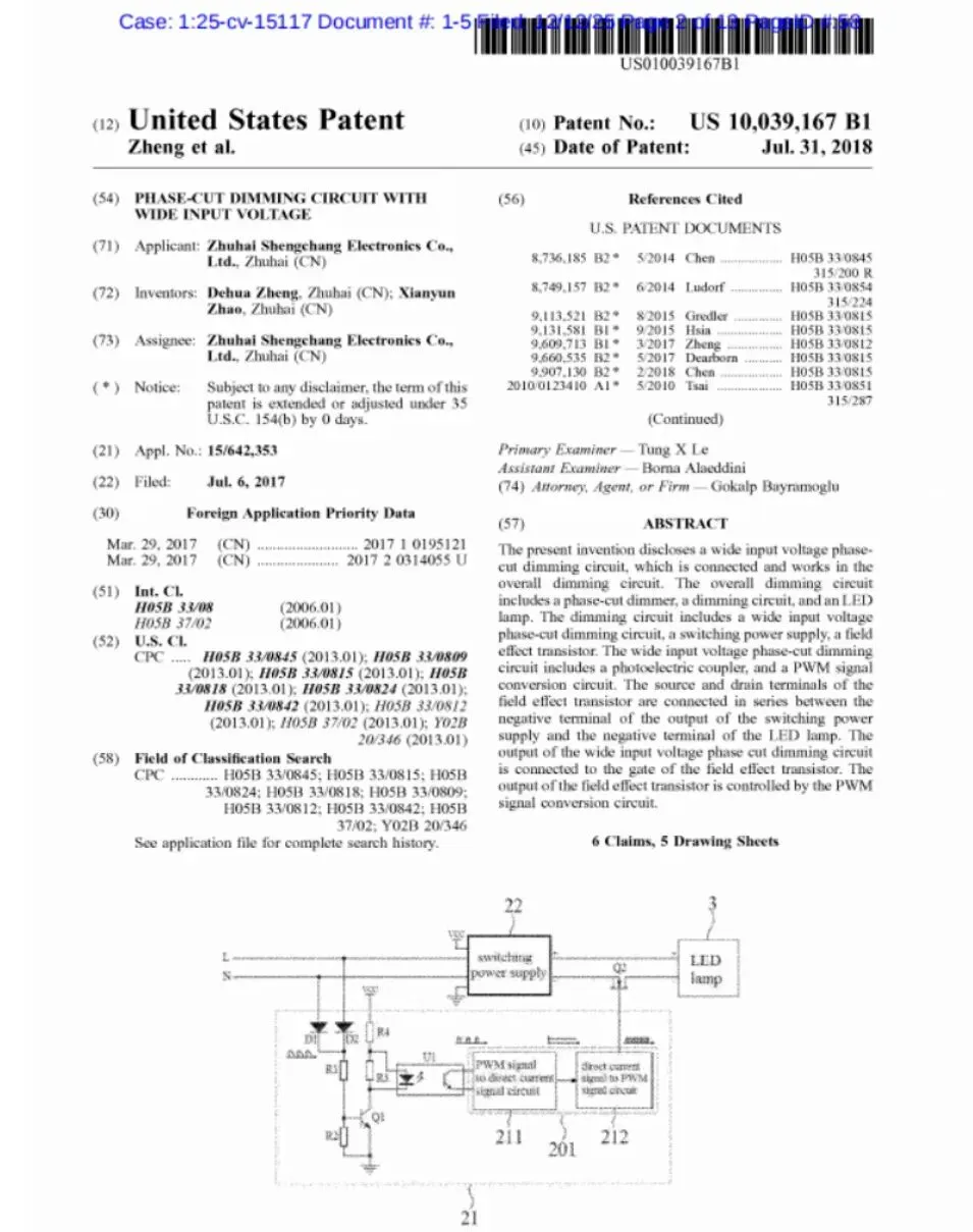 LED控制驱动器五个专利强强维权!卖家赶紧排查!【25-cv-15117】