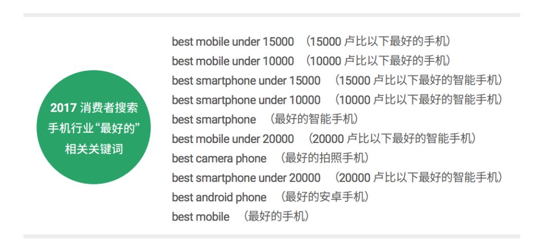因此,如果你在印度做智能手机的线上营销,建议关键词投放可以做:最好的+长尾关键词(拍照手机、价格、听音乐手机等),这样有更大可能吸引到印度的消费者。