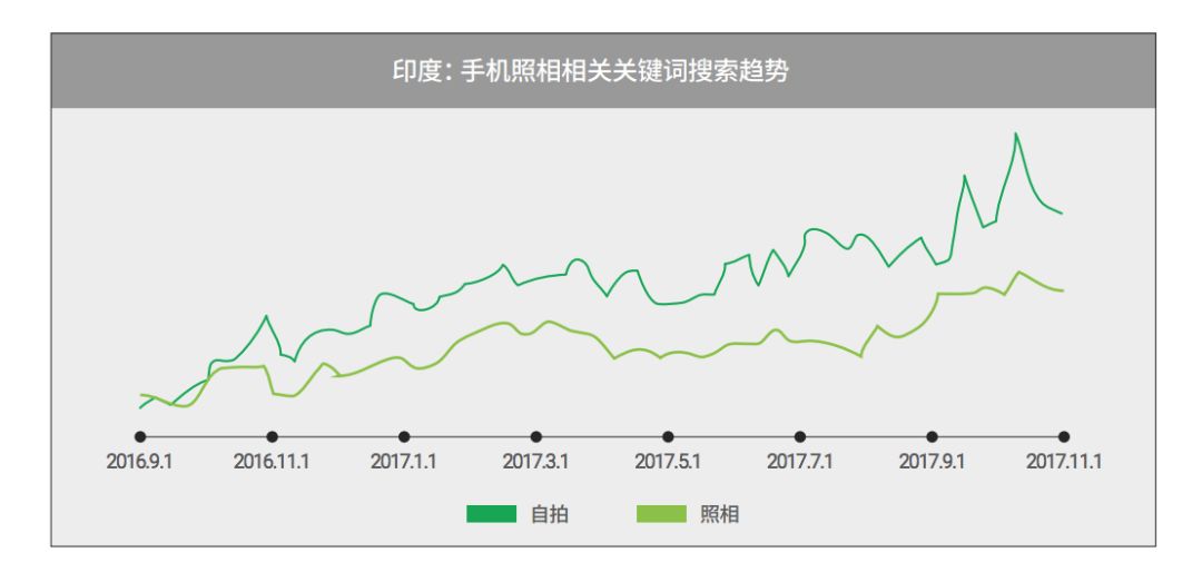 印度消费者对于手机自拍、照相功能的搜索热度快速上升。与相机功能相关的关键词当中,“自拍相机”的搜索量高于照相,显示出自拍潮流在印度的火热。相关关键词中也出现了中国品牌,显示出中国手机的照相功能在印度有较高的关注度。