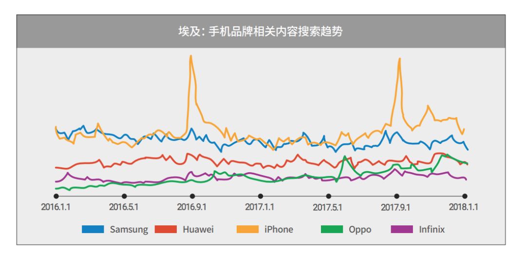 尽管传统国际手机巨头仍然占据主导地位,但中国手机品牌的搜索热度呈持续上升态势。埃及市场最受关注的两大中国品牌是华为和OPPO。 在过去几年,华为都是埃及消费者最关注的中国手机品牌,其市场搜索指数排名一直位于 第三。2017 年年中开始,OPPO 手机的受关注度开始迅速提升,2017 年底时已与华为手机 的搜索热度持平。