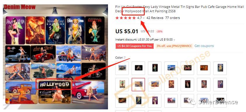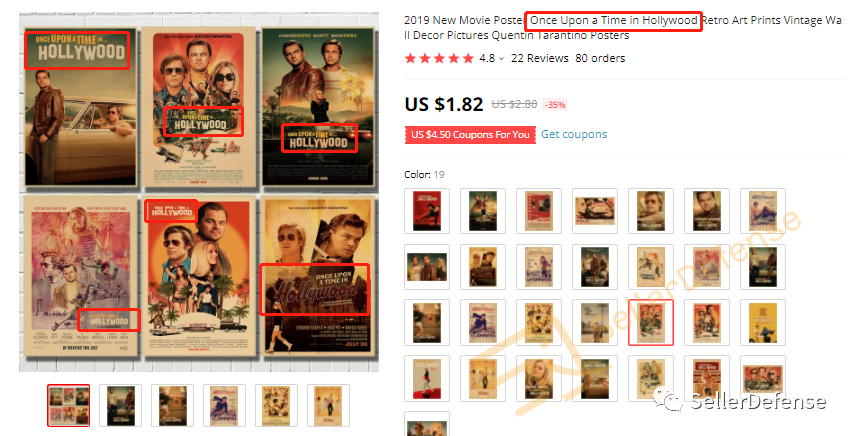 有卖家反馈是因为售卖电影《好莱坞往事》(英语:Once Upon a Time in Hollywood)海报而被冻结了账户的,建议各位卖家相关的好莱坞产品都不要再卖了。