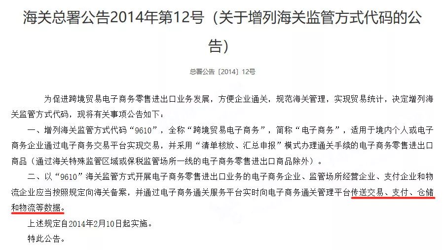 包含订单、商品、支付、物流的相关信息,由物仓储/物流企业通过跨境电商通关服务平台向监管部门推送清单信息。