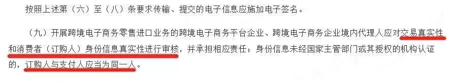 而在海关总署2018年第194号公告中进一步强调,开展跨境电子商务零售进口业务的跨境电子商务平台企业、跨境电子商务企业境内代理人应对交易真实性和消费者(订购人)身份信息真实性进行审核,并承担相应责任;身份信息未经国家主管部门或其授权的机构认证的,订购人与支付人应当为同一人。